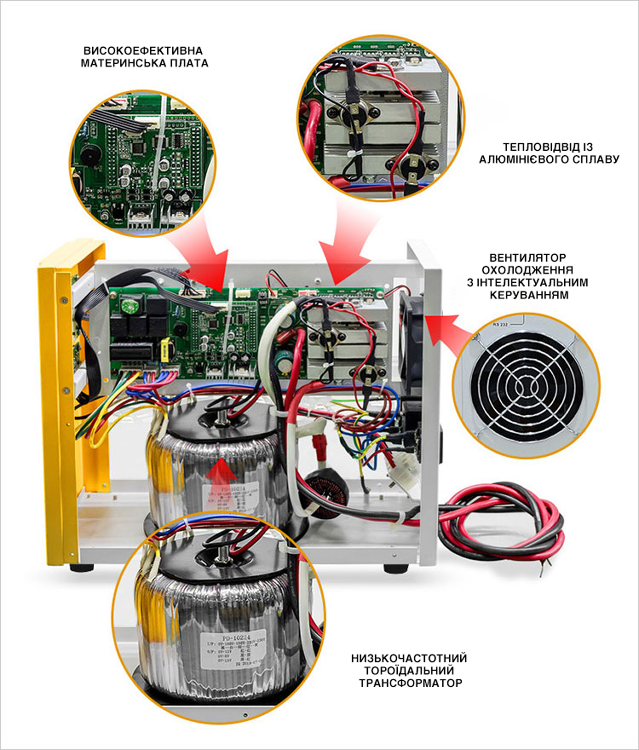 - • Вихід чистої синусоїди;• Низькочастотний тороїдальний трансформатор, який підвищує ефективність роботи системи;